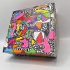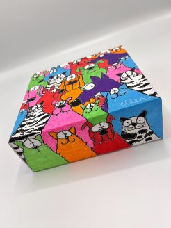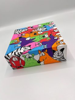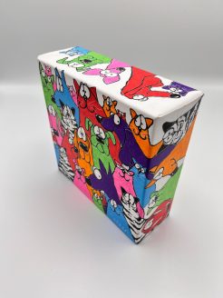 Le tableau représente une collection colorée de chats et de chiens, chacun avec sa propre personnalité expressive et décalée. Les chats sont représentés dans un arc-en-ciel de couleurs vives, dont le rose, le rouge, l’orange, le vert, le bleu et le violet, ce qui forme un ensemble joyeux et dynamique. Les chats sont stylisés avec des lignes noires épaisses et des détails humoristiques qui vous feront sourire.