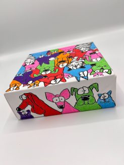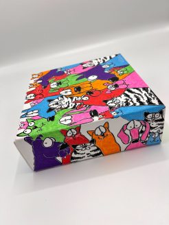 Apportez le chaos joyeux du monde chat/chien d’Ellen Moorman dans votre maison avec cette peinture unique. Parfait pour les chambres d’enfants, les coins de jeux ou tout espace qui pourrait utiliser une touche ludique et colorée. Ajoutez cette œuvre d’art à votre collection et profitez de l’énergie vibrante et de la joie qu’elle dégage chaque jour.