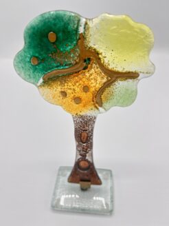 Les formes organiques et les subtils accents de couleurs confèrent à l’ensemble une apparence dynamique, tandis que le tronc robuste dans des tons bruns chauds apporte équilibre et résistance. L’utilisation de verre transparent et de petites bulles à l’intérieur permet à l’image de jouer magnifiquement avec la lumière – toujours légèrement différente, selon l’heure de la journée.