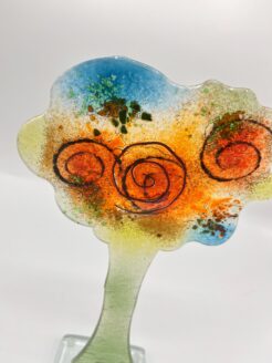 Une œuvre d’art colorée pleine de fantaisie et de dynamisme – cet arbre en verre de 32 cm de haut est une interprétation ludique de la nature, fabriquée à la main avec un souci du détail et une expérience des couleurs. La couronne large et aérée est une explosion de tons orange et rouges chauds, combinés à du vert frais et du bleu ciel, comme si l’arbre tenait un morceau d’un coucher de soleil d’été.