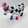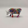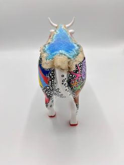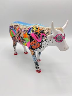 La statue représente une vache complètement transformée en une scène de plage vibrante. Le dos de la vache est décoré comme une plage miniature, avec une mer bleue et du sable, faisant ressortir l’ultime sensation de plage. Les côtés de la vache sont décorés de ballons de plage colorés, de flamants roses, de parasols et d’autres accessoires de plage, avec des nuances vives comme le rose, l’orange, le vert et le bleu. L’utilisation de points et de lignes noirs et blancs ajoute un contraste ludique au design.