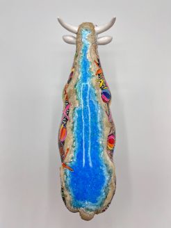 L’association des couleurs estivales et des détails ludiques, comme les lunettes de soleil sur la vache, confèrent à cette statue un look joyeux et décalé. La vision artistique d’Ellen Moorman prend vie dans cette œuvre d’art dynamique, parfaite pour tous ceux qui souhaitent créer une atmosphère ludique et tropicale dans leur maison.