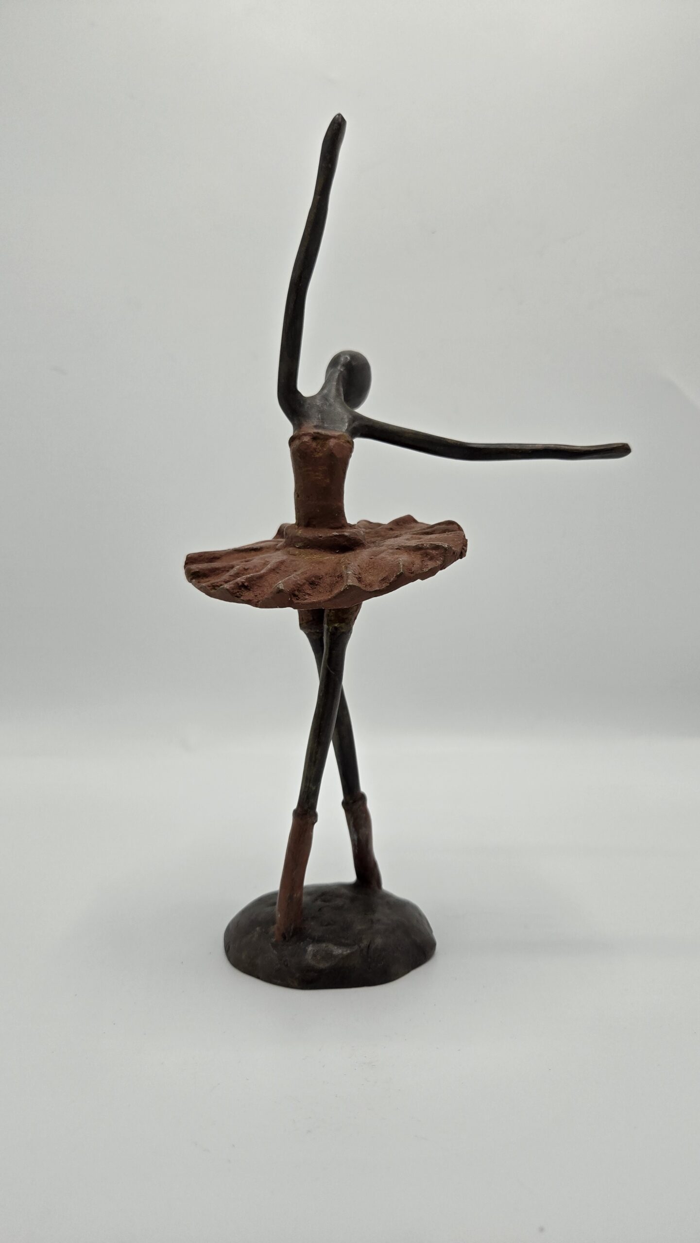 Dit stijlvolle bronzen beeld van een ballerina vangt de sierlijkheid en expressie van dans in een tijdloos kunstwerk. Met een hoogte van circa 25 cm straalt deze vrouwfiguur kracht, elegantie en balans uit. De ranke lijnen van het lichaam en de expressieve houding geven een dynamische indruk, alsof de ballerina midden in haar choreografie bevroren is.