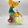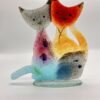 Le corps du chat est richement décoré de tons chauds de sable et de marron, égayés par des accents colorés en orange, bleu et vert. Le jaune vif de la tête et de la queue offre un look frais et ensoleillé, tandis que la patte bleu vif offre un détail étonnamment ludique. La transparence du verre et l’utilisation de bulles d’air confèrent à l’image une profondeur et un caractère supplémentaires.
