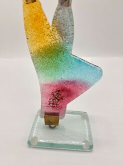 Avec son dégradé de couleurs vibrantes de rouge, orange, jaune, vert, bleu et rose, cette image respire la joie de vivre pure. La fusion colorée du verre transparent avec des accents ludiques de verre fritté crée un look unique qui révèle quelque chose de nouveau à chaque fois à la lumière.