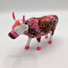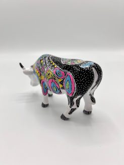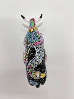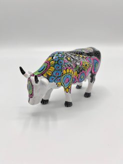 Cette œuvre montre une combinaison ludique de motifs floraux et graphiques qui transforment la vache en une figure dynamique et énergique. Les côtés de la vache sont richement décorés de fleurs colorées et de formes abstraites dans des tons vifs comme le rose, le vert, le bleu et le jaune. Le design contrasté noir et blanc avec des points et des lignes donne un accent graphique moderne et fait ressortir les couleurs.