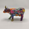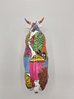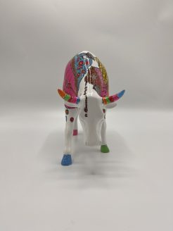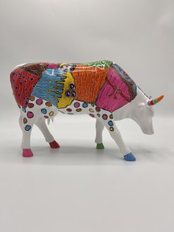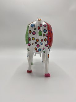 La figurine représente une vache entièrement recouverte d’une variété de motifs de cupcakes colorés. Les couleurs vives comme l’orange, le rose, le jaune, le vert, le bleu et le rouge se combinent harmonieusement avec des motifs détaillés de cupcakes et de pois, créant un ensemble joyeux et visuellement attrayant. Chaque face de la vache révèle différents motifs de délicieux cupcakes, qui forment ensemble une œuvre d’art festive et enchanteresse.