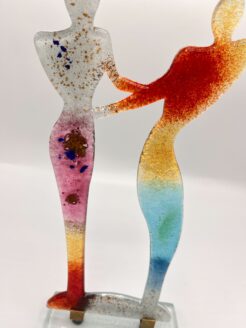 Laissez la couleur et le mouvement se réunir dans cette sculpture en verre expressive « Ritmo ». Cette œuvre d’art de 33 cm de haut représente deux personnages stylisés dans une interaction gracieuse, reliés par un mouvement fluide qui représente la danse, le rythme et l’harmonie.