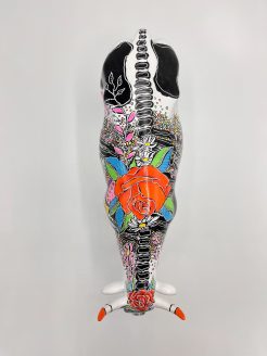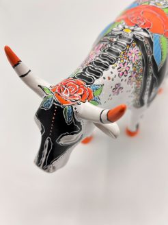 La tête de la vache présente un design de masque noir et blanc spectaculaire, lui donnant une apparence de style Catrina, tandis que les cornes et les sabots orange vif ajoutent une touche énergique et vibrante. Une rose saisissante, symbole traditionnel d’amour et de souvenir, orne le dos de la statue, entourée de fleurs luxuriantes et de décorations délicates.