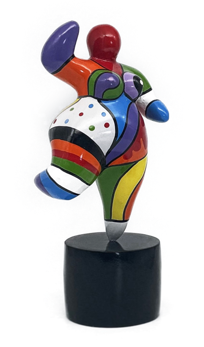 Apportez de la couleur et de la gaieté à votre intérieur avec cette statue Dolly animée. Inspirée de l’art de Niki de Saint Phalle, cette sculpture rayonne d’énergie et de joie avec sa pose dynamique et ses formes expressives. La statue est peinte à la main dans un mélange de couleurs vives et de motifs graphiques, ce qui en fait un véritable accroche-regard. Montée sur un socle noir robuste, cette œuvre est parfaite pour les amateurs de sculptures modernes et pop art. Une pièce décorative unique qui sublimera n’importe quelle pièce !