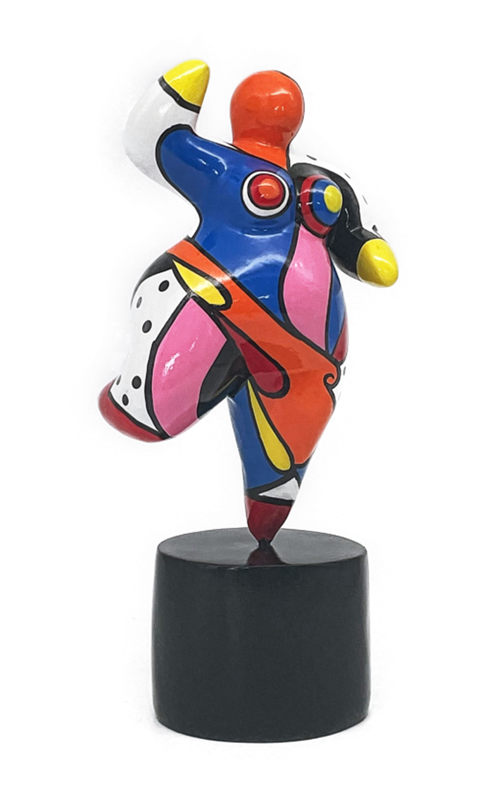 Apportez de la couleur et de la gaieté à votre intérieur avec cette statue Dolly animée. Inspirée de l’art de Niki de Saint Phalle, cette sculpture rayonne d’énergie et de joie avec sa pose dynamique et ses formes expressives. La statue est peinte à la main dans un mélange de couleurs vives et de motifs graphiques, ce qui en fait un véritable accroche-regard. Montée sur un socle noir robuste, cette œuvre est parfaite pour les amateurs de sculptures modernes et pop art. Une pièce décorative unique qui sublimera n’importe quelle pièce !