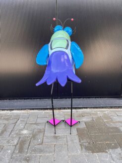 Cet oiseau artificiel est fabriqué à la main et recouvert d’une peinture automobile brillante, qui lui confère non seulement un aspect luxueux, mais aussi une protection supplémentaire contre les intempéries. Son bec rose vif, ses ailes bleu-violet, ses yeux comiques et ses longues pattes élégantes confèrent à Lorre un caractère joyeux et presque surnaturel.