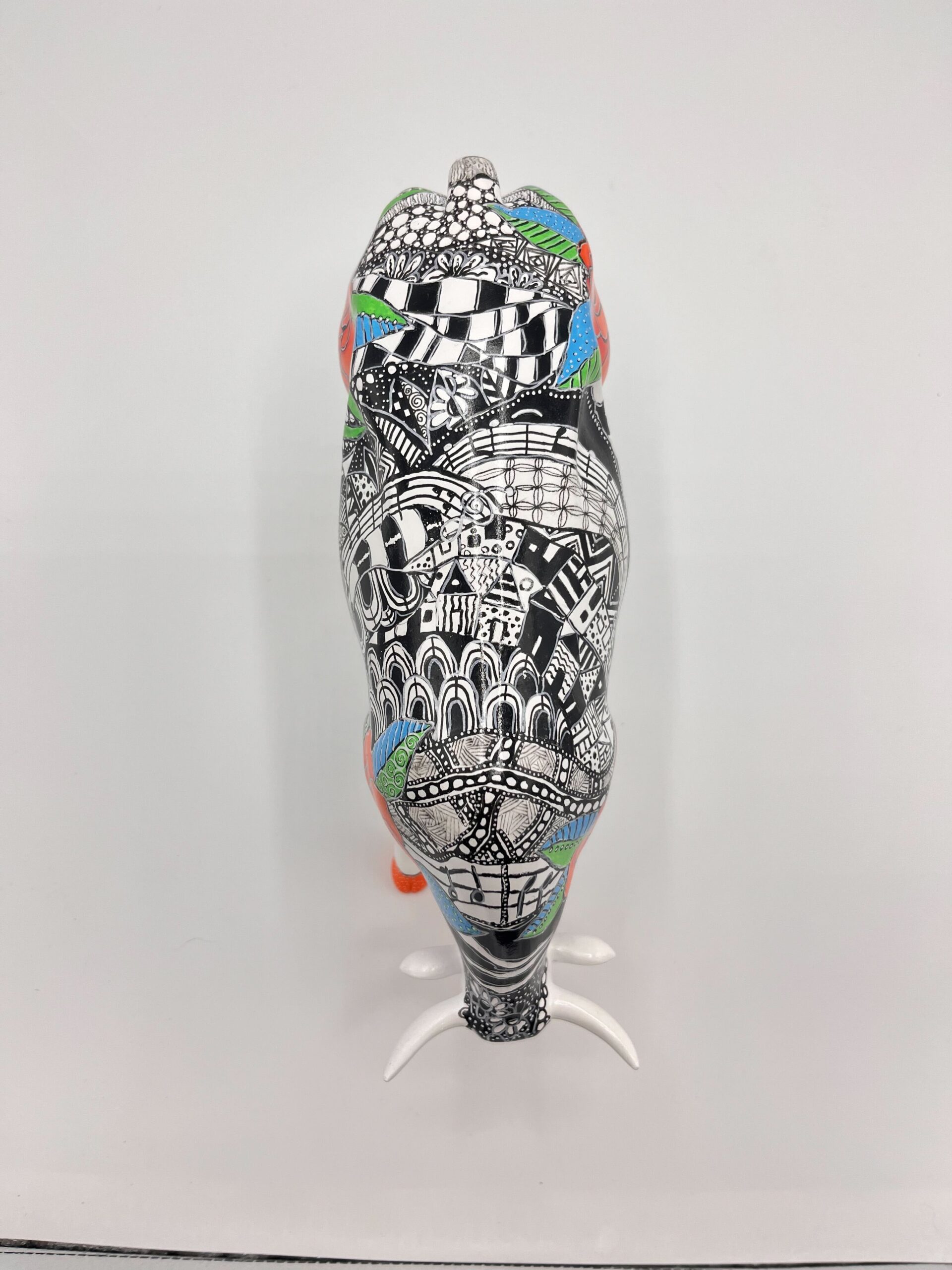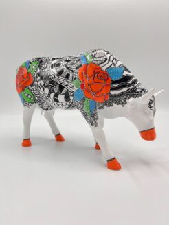 Apportez une explosion de couleur et de caractère à votre intérieur avec « Kiss from a Rose », une sculpture unique et expressive de l’artiste Ellen Moorman. Ce taureau peint à la main, avec sa silhouette stylisée, est décoré d’un motif noir et blanc saisissant rappelant les motifs de type Zentangle. En revanche, les roses rouges vibrantes aux feuilles colorées en vert, bleu et turquoise fleurissent élégamment à partir du jeu abstrait des lignes.