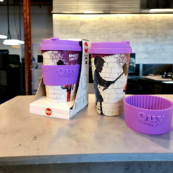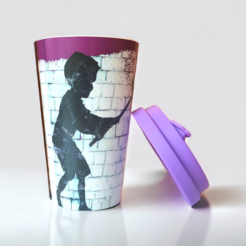 La nouvelle gamme de gobelets de voyage Banksy’s Graffiti 400 ml est fabriquée en R-Pet, un plastique recyclé de qualité alimentaire. L’ensemble de la gamme a été conçu, défini et développé en Italie.