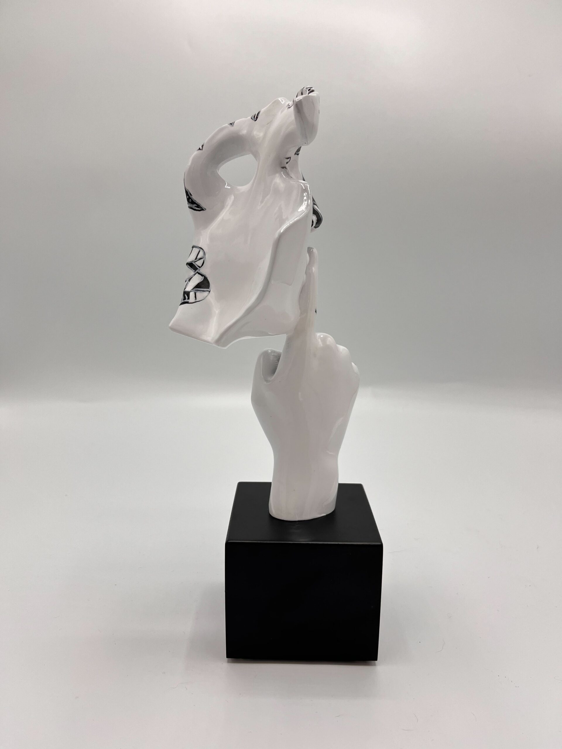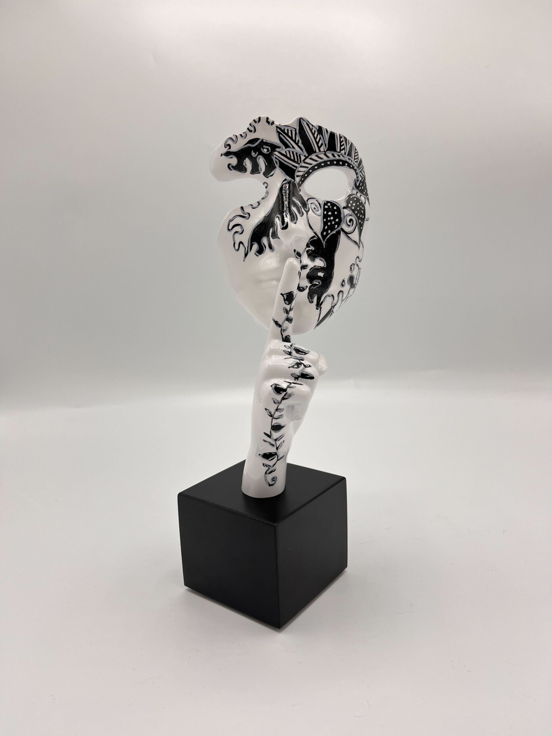 La sculpture représente un masque tenu devant un visage par une main élégante, posé sur un élégant socle noir. Les lignes noires décoratives et les motifs de feuilles créent un jeu harmonieux de force et de subtilité, un véritable accroche-regard dans tout intérieur.