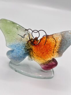 Le papillon rayonne d’un mélange harmonieux de couleurs – du vert frais et du bleu vif à l’orange chaud et au rose foncé. Les couleurs se fondent sans effort les unes dans les autres, comme si elles dansaient sur le verre transparent. Le fil forgé à la main forme des antennes gracieuses, ce qui confère à l’ensemble un caractère charmant et ludique.