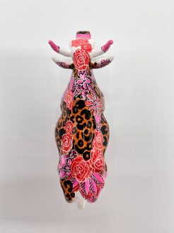 L’arrière-plan de la statue est recouvert d’un imprimé léopard marron et noir vibrant, créant un look audacieux et moderne. De délicates fleurs roses et rouges sont peintes dessus, ce qui donne à la statue une touche féminine surprenante. Les cornes, les sabots et le museau de la vache sont finis dans une couleur rose ludique et présentent un motif en pointillés, qui donne un accent unique et une apparence joyeuse.