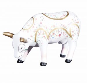 Rendada means Lace in Portuguese. These are lace objects that often have multiple curves and are filled with a crocheted floral motif. Rendada, created by Rayanne Ferreira for CowParade Reçife 2017, brings this motif to life with gold bands and flowers.