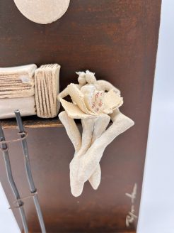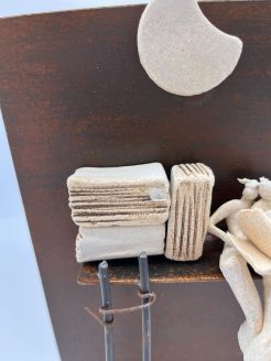 Cette œuvre magnifique et intrigante de Roser Oter, intitulée « Under the Moon », combine des tons terreux subtils avec un design minimaliste mais profondément expressif. La pièce se compose d’un panneau métallique robuste de couleur rouille qui sert de toile de fond à de délicats éléments en céramique. Un croissant de lune flotte au sommet de l’œuvre, et en dessous se trouvent des formes stylisées rappelant des livres, une échelle et une fleur ou une figure mystérieuse et abstraite, le tout exécuté dans des tons naturels de céramique.