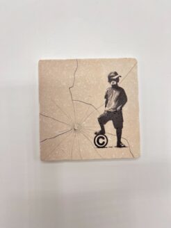 Un jeune enfant, s’appuyant nonchalamment sur un symbole de droit d’auteur comme s’il s’agissait d’un ballon de football, questionne les droits de propriété et la liberté de création. Les fissures en arrière-plan renforcent le sentiment de résistance et de rupture des règles établies. Cette œuvre, dans l’esprit du street art, invite le spectateur à se demander à qui appartiennent véritablement ses idées.