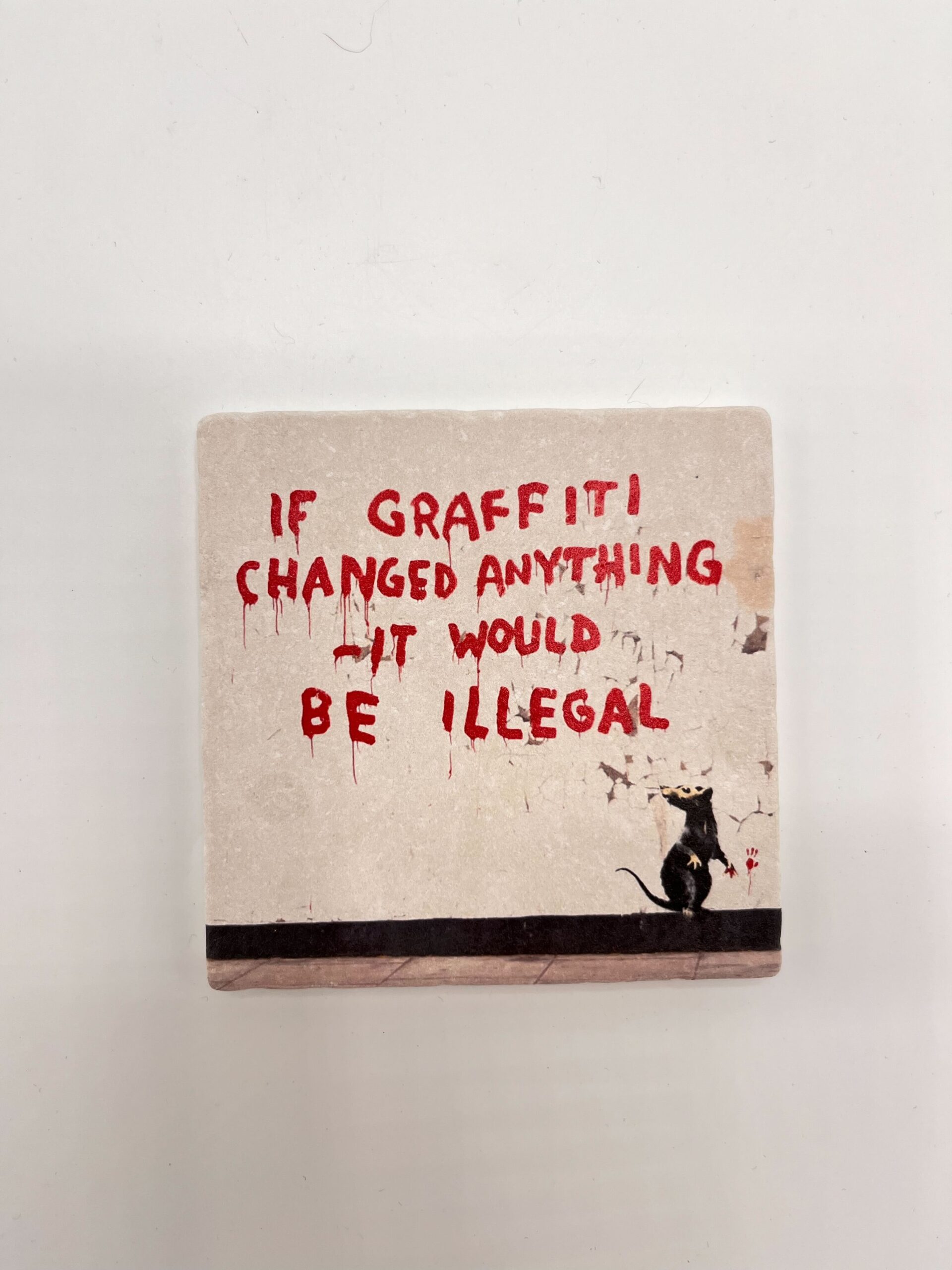 Avec de la peinture rouge sang et un rat rebelle, Banksy laisse un message provocateur : « Si le graffiti changeait quoi que ce soit, ce serait illégal.» Ce street art emblématique aborde la tension entre liberté créative et contrôle social. Le rat, symbole récurrent de résistance dans l’œuvre de Banksy, semble avoir peint le texte lui-même – un acte de protestation silencieux dans un monde où même l’art est réglementé.